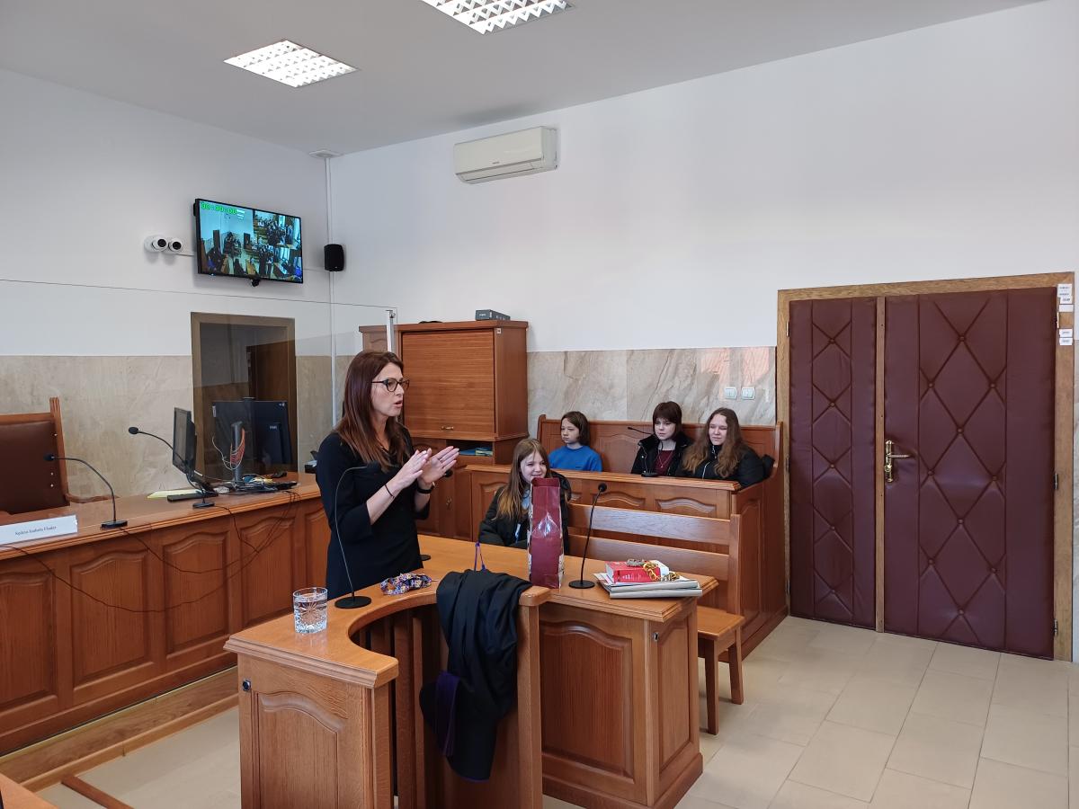 Na spotkaniu uczniowie zapoznali się z podstawowymi wiadomościami na temat funkcjonowania sądownictwa w Polsce, uczestniczyli w symulacji rozprawy sądowej oraz dyskusji na temat wyrokowania.