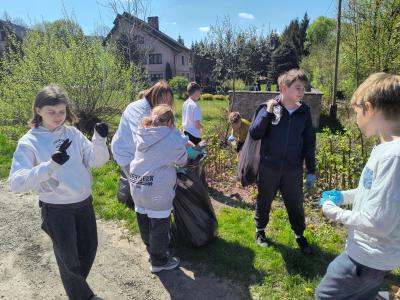 W naszej szkole również prowadzone były liczne akcje powiązane ze Światowym Dniem Ziemi i Zdrowia. Uczniowie przygotowali gazetki, zdrowe posiłki, sadzili drzewa, a 23 kwietnia 2025r. sprzątali najbliższe środowisko. Akcja sprzątania Baczyna została poprzedzona informacją skierowaną do rodziców. Uczniowie zostali zapoznani z zasadami bezpieczeństwa, zaopatrzeni w rękawiczki oraz worki na śmieci pod kontrolą nauczycieli sprzątali okolicę Baczyna. Akcja cieszyła się dużą popularnością. Uczniowie z pełnymi workami śmieci w miłej atmosferze posprzątali najbliższe otoczenie.