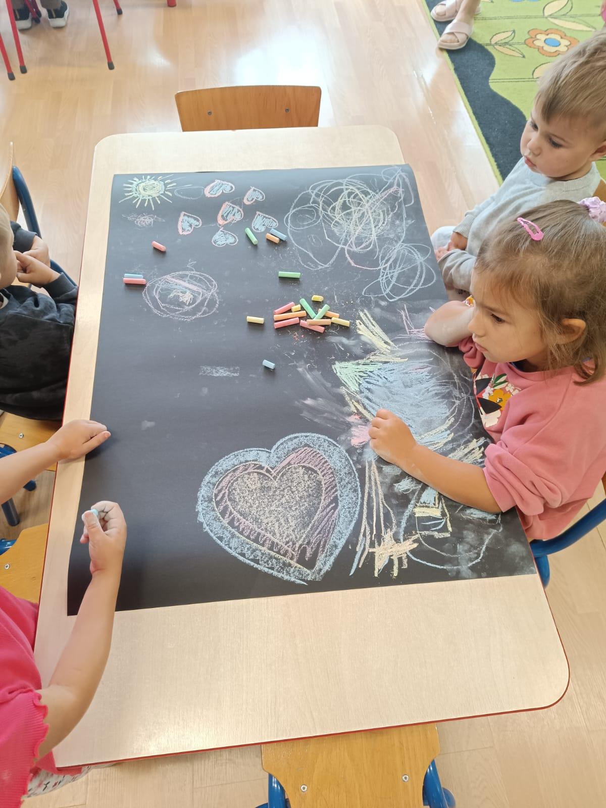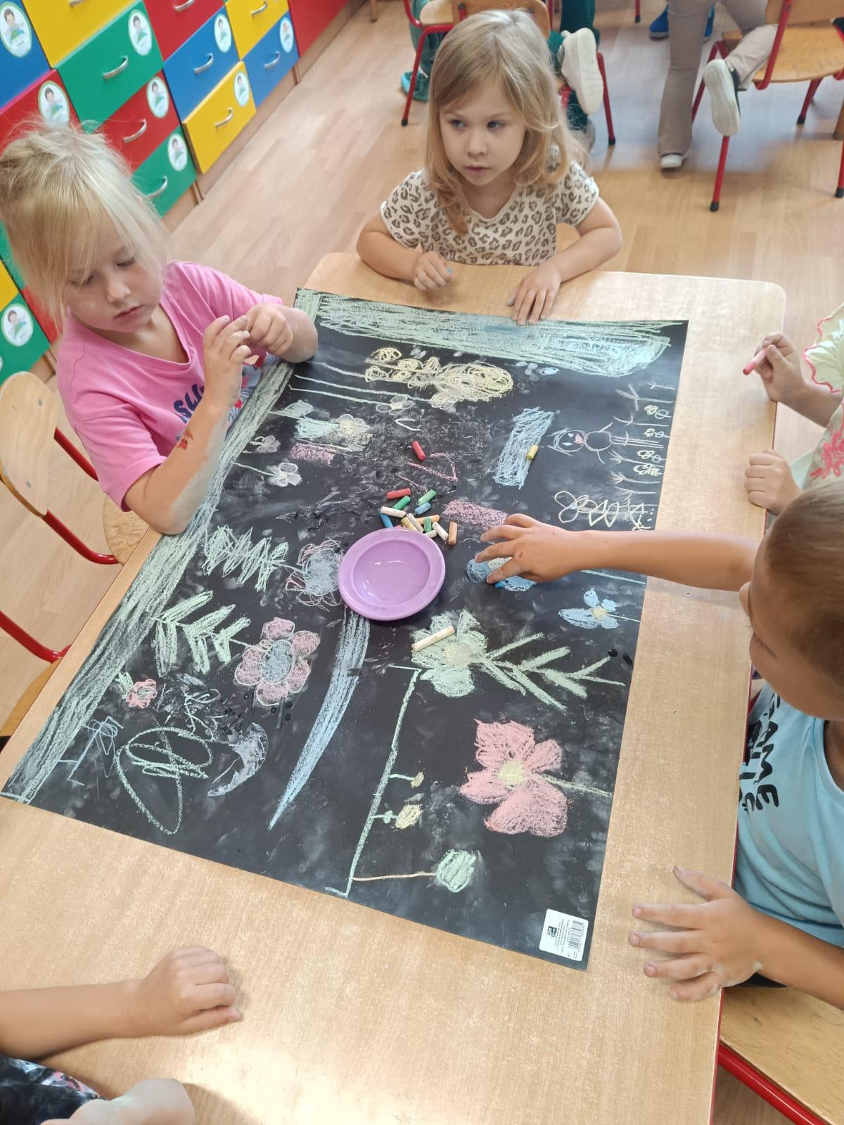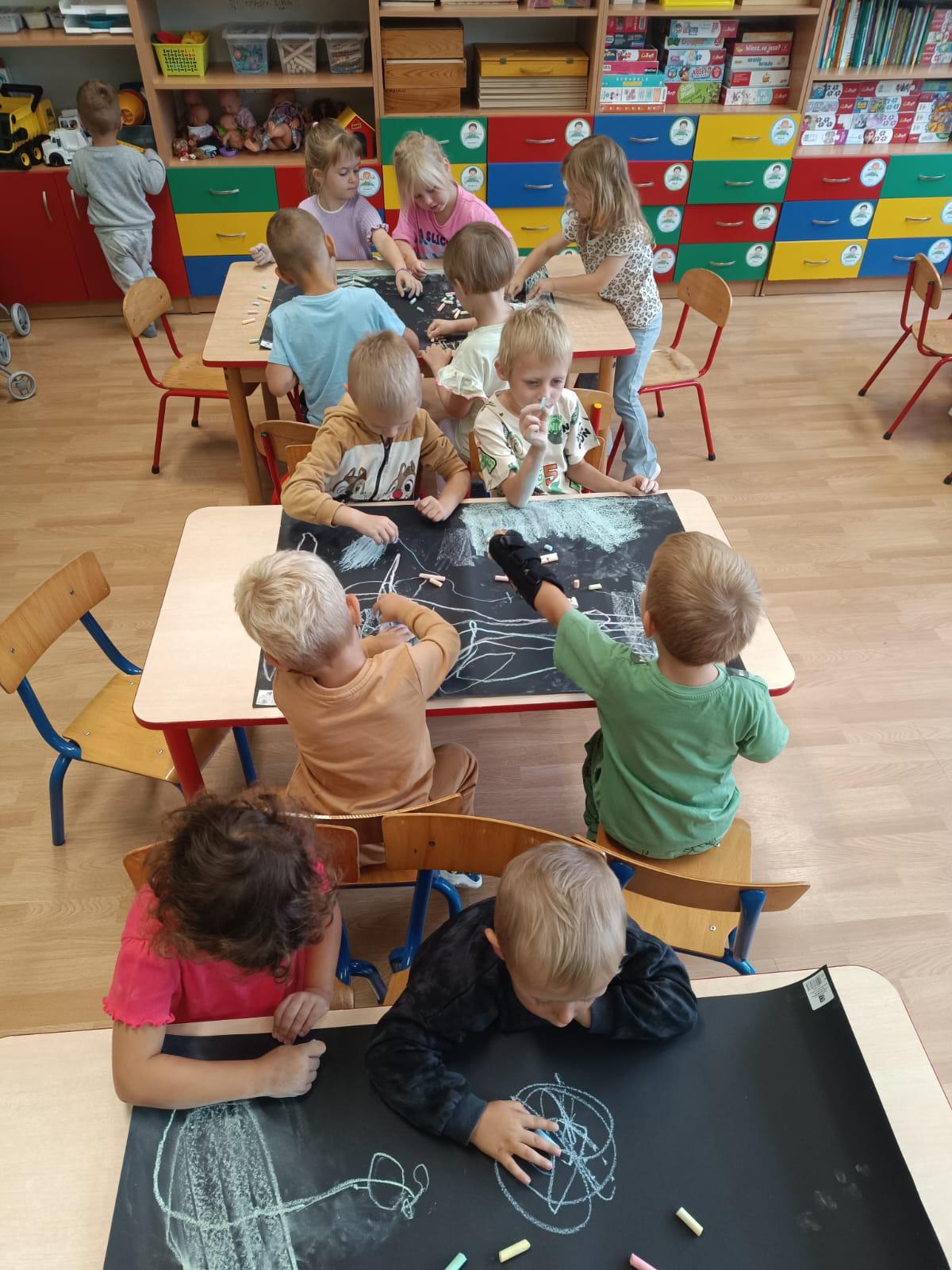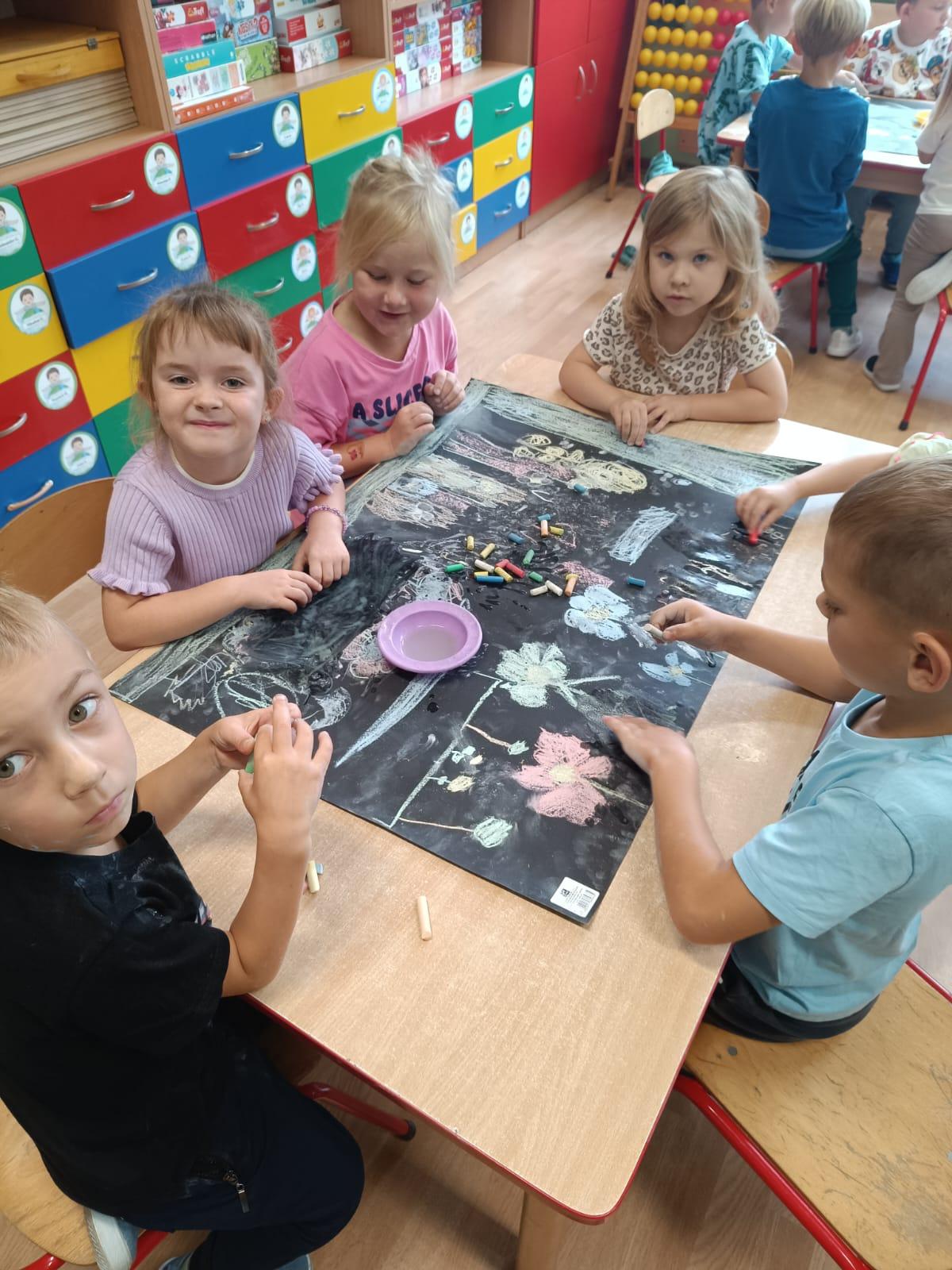 W dniu 08.09.2025r. nasze przedszkolaki wzięły udział w kreatywnych zajęciach artystycznych, podczas których malowały kolorową kredą na czarnych arkuszach papieru. Nietypowe tło pozwoliło dzieciom odkryć nowe efekty plastyczne i sprawiło, że ich prace wyglądały jak małe dzieła sztuki!