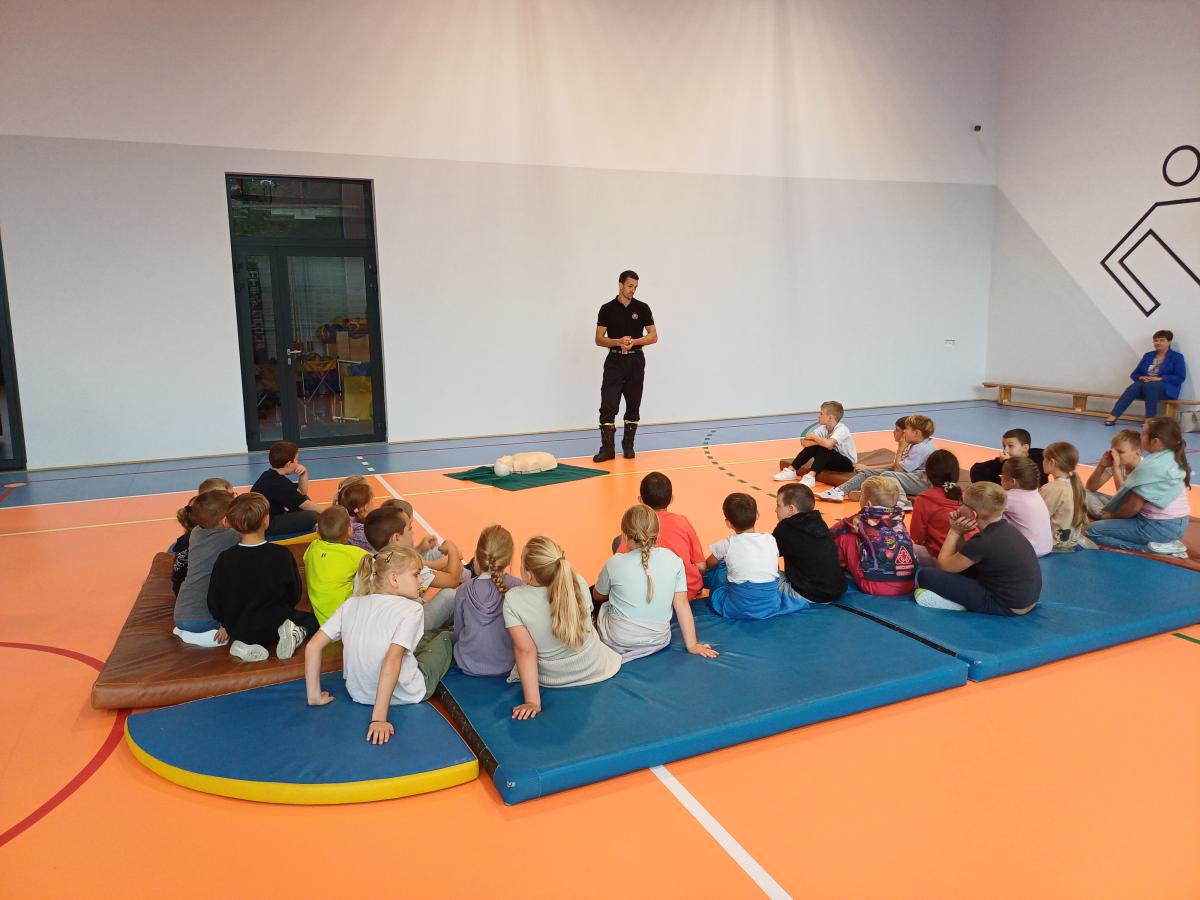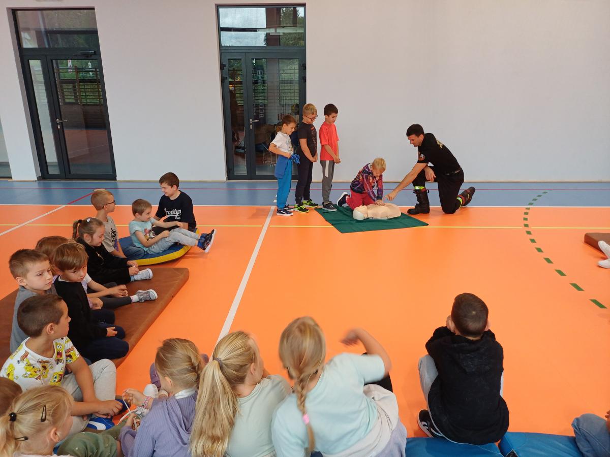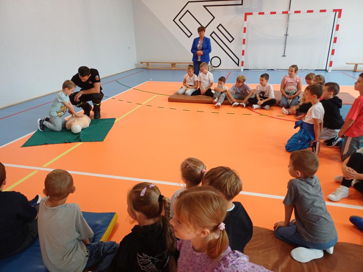 Dnia 16.09.2025r. naszą szkołę odwiedził przedstawiciel OSP w Baczynie. Uczniowie kl.1-3 z zachwytem i wielkim zaciekawieniem uczestniczyli w spotkaniu, podczas którego strażak przeprowadził pogadankę na temat zasad udzielania pierwszej pomocy. Zaprezentował na fantomie jak należy w prawidłowy sposób wykonywać resuscytację krążeniowo – oddechową, a następnie uczyli się tego uczniowie. Po takiej praktycznej lekcji na pewno najważniejsze zasady udzielania pierwszej pomocy zostaną przez uczniów klas 1-3 dobrze zapamiętane.