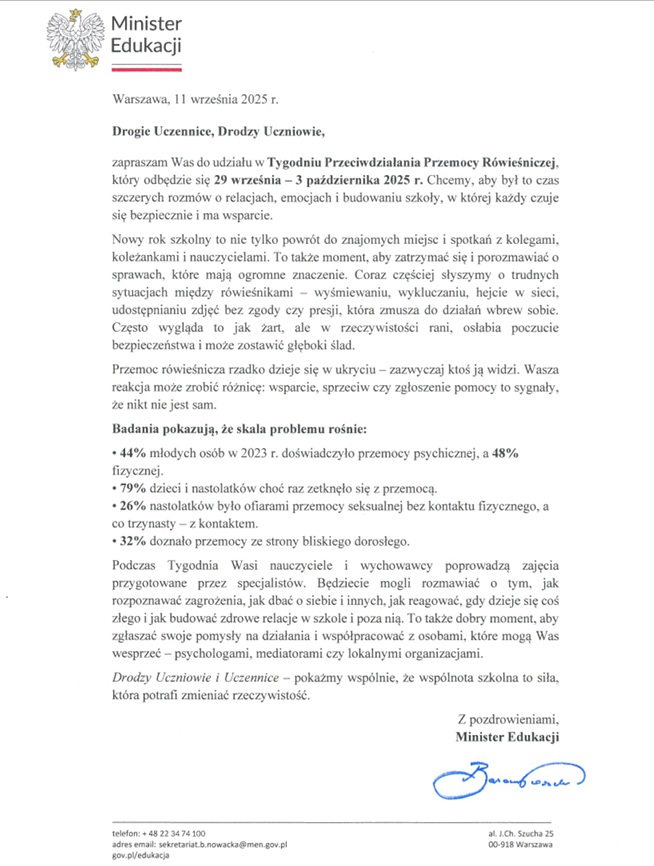 Zapraszamy Rodziców do włączenia się w tę akcję. W załącznkach do postu umieszczam List Ministra Edukacji skierowany do Rodziców, Uczniów i Nauczycieli oraz materiały, które pomogą nam przeciwdziałać przemocy rówieśniczej i zapewnią dzieciom bezpieczną przestrzeń do nauki, zabawy i wszechstronnego rozwoju.