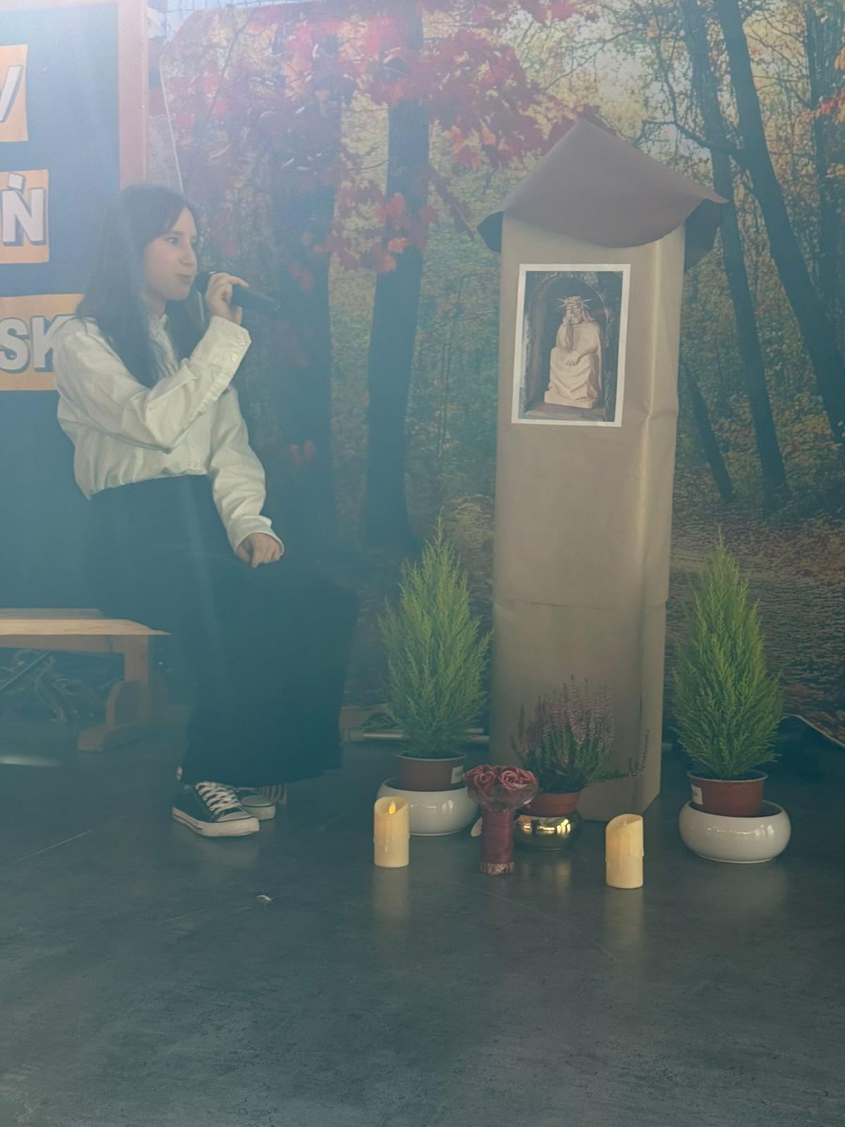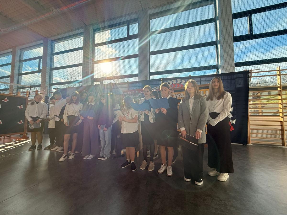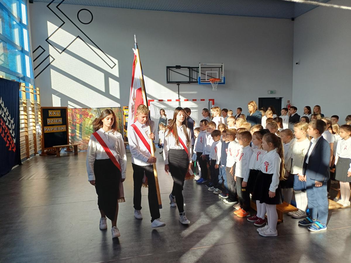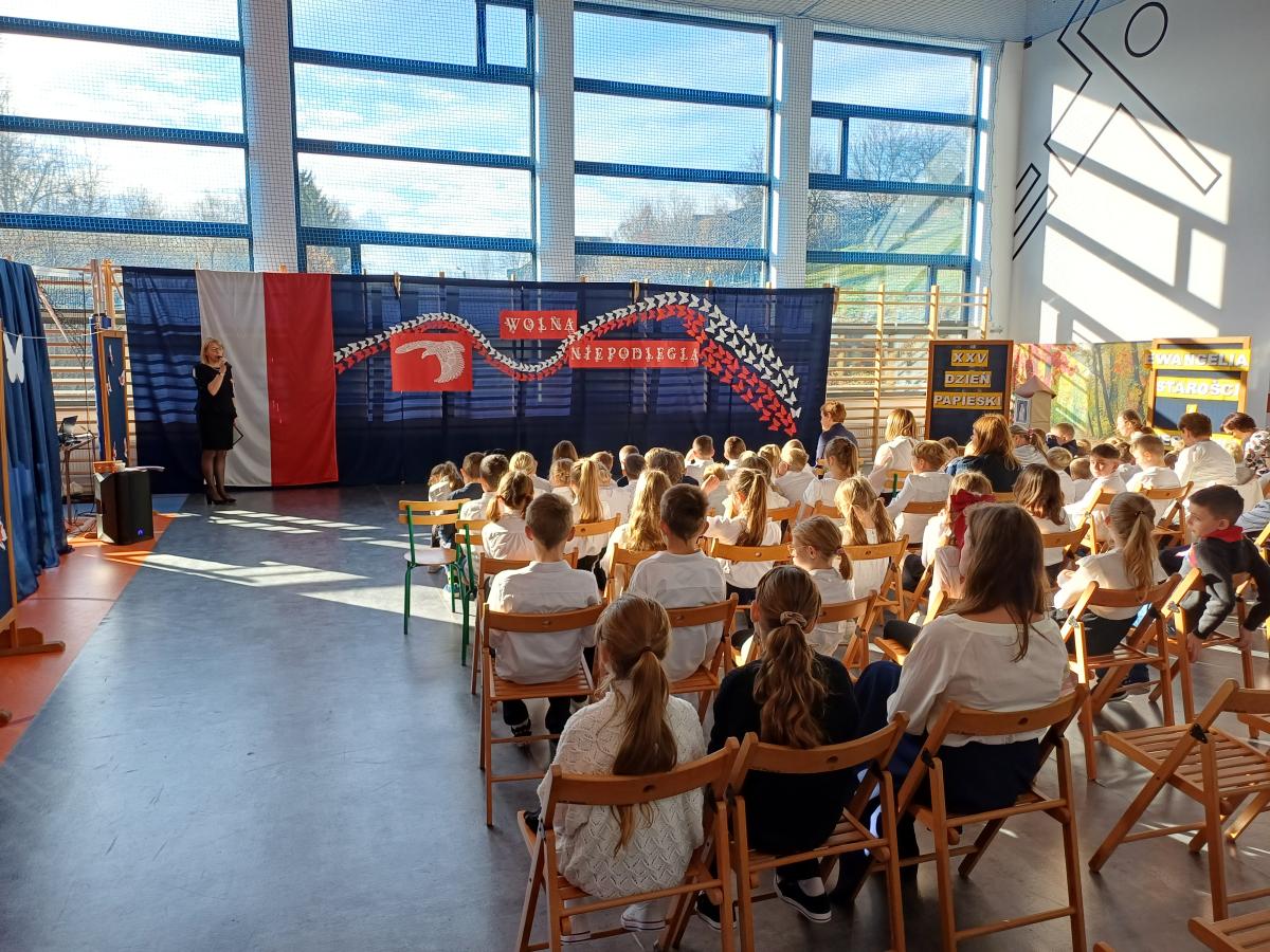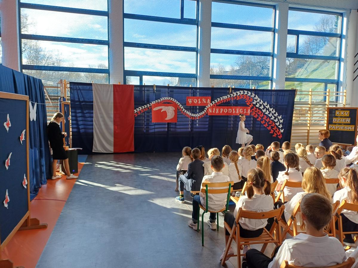 Dnia 12.11.2025r. w naszej szkole odbył się uroczysty apel poświęcony dwóm ważnym wydarzeniom: Narodowemu Świętu Niepodległości oraz XXV Dniowi Papieskiemu. Uroczystość rozpoczęła się od wspólnego odśpiewania Hymnu Narodowego i krótkiego przemówienia Pani Dyrektor, co wprowadziło wszystkich zgromadzonych w podniosły i refleksyjny nastrój.