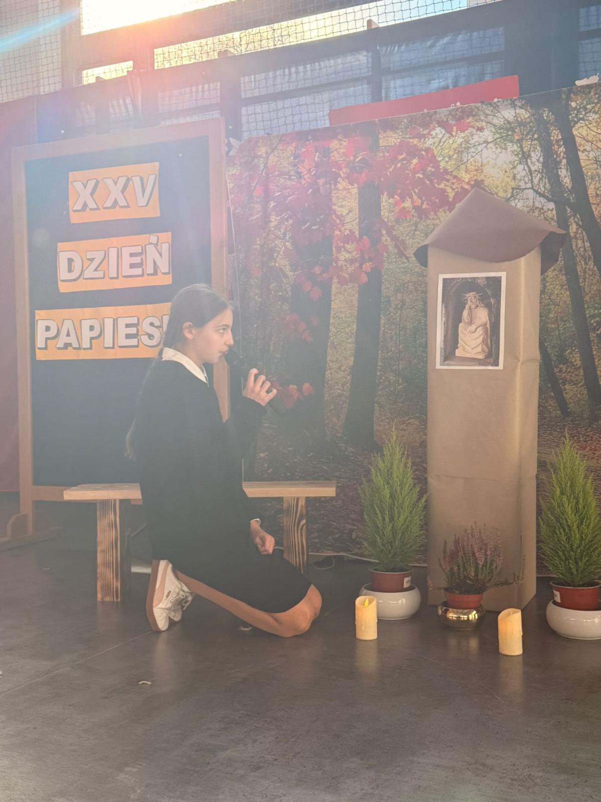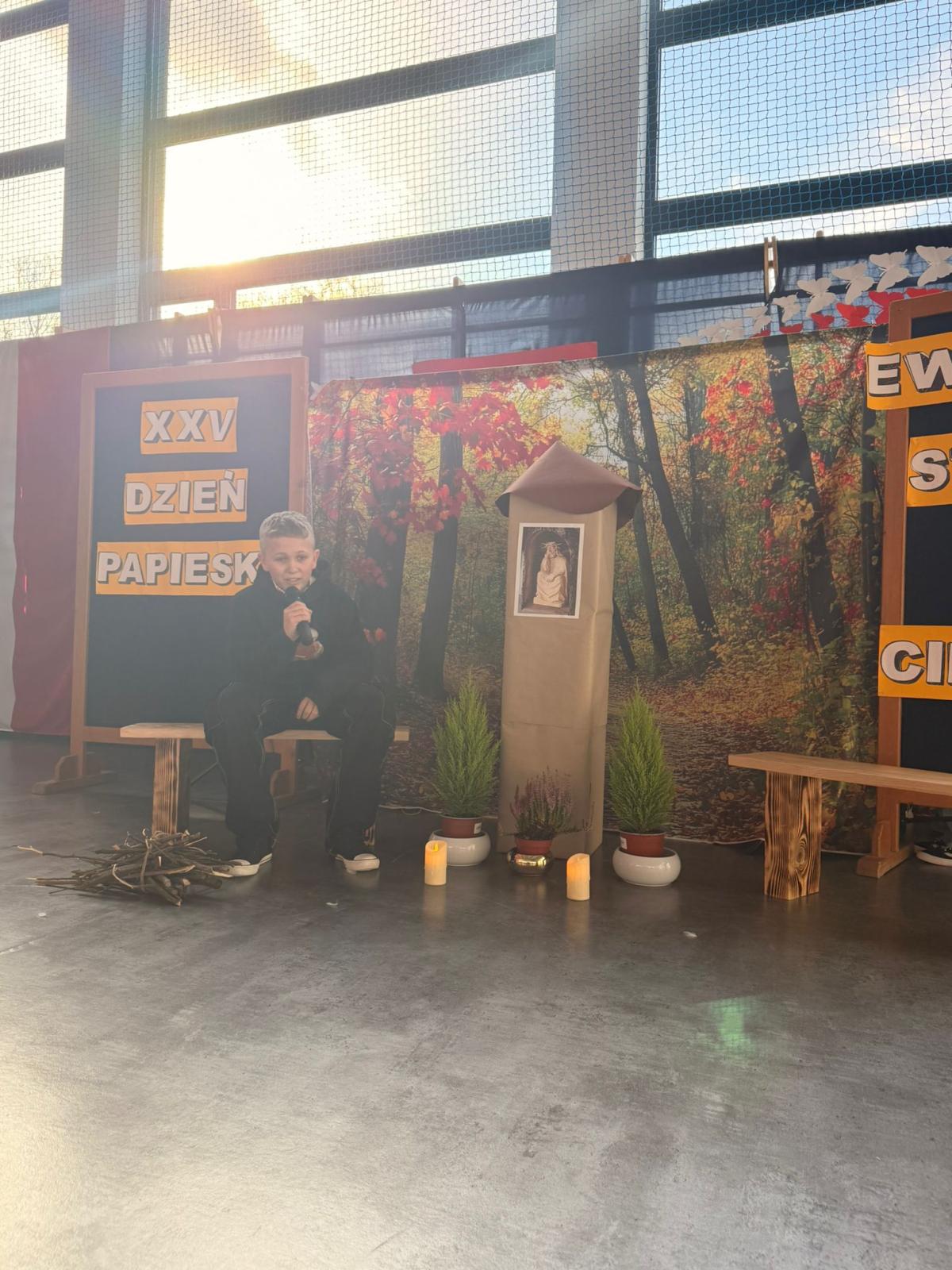 Druga część uroczystości była poświęcona obchodom XXV Dnia Papieskiego. Uczniowie klas VI, VII i VIII przygotowali wzruszające przedstawienie pt. „Ewangelia starości i cierpienia”, nawiązujące do nauczania św. Jana Pawła II i słów z Pisma Świętego. Ukazali w nim, jak wielką wartość w życiu człowieka ma godność, szacunek, miłość oraz wrażliwość na osoby starsze i cierpiące.