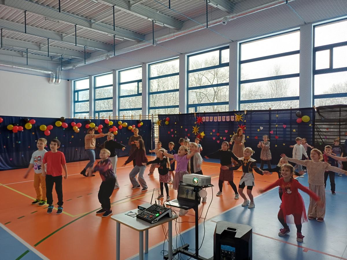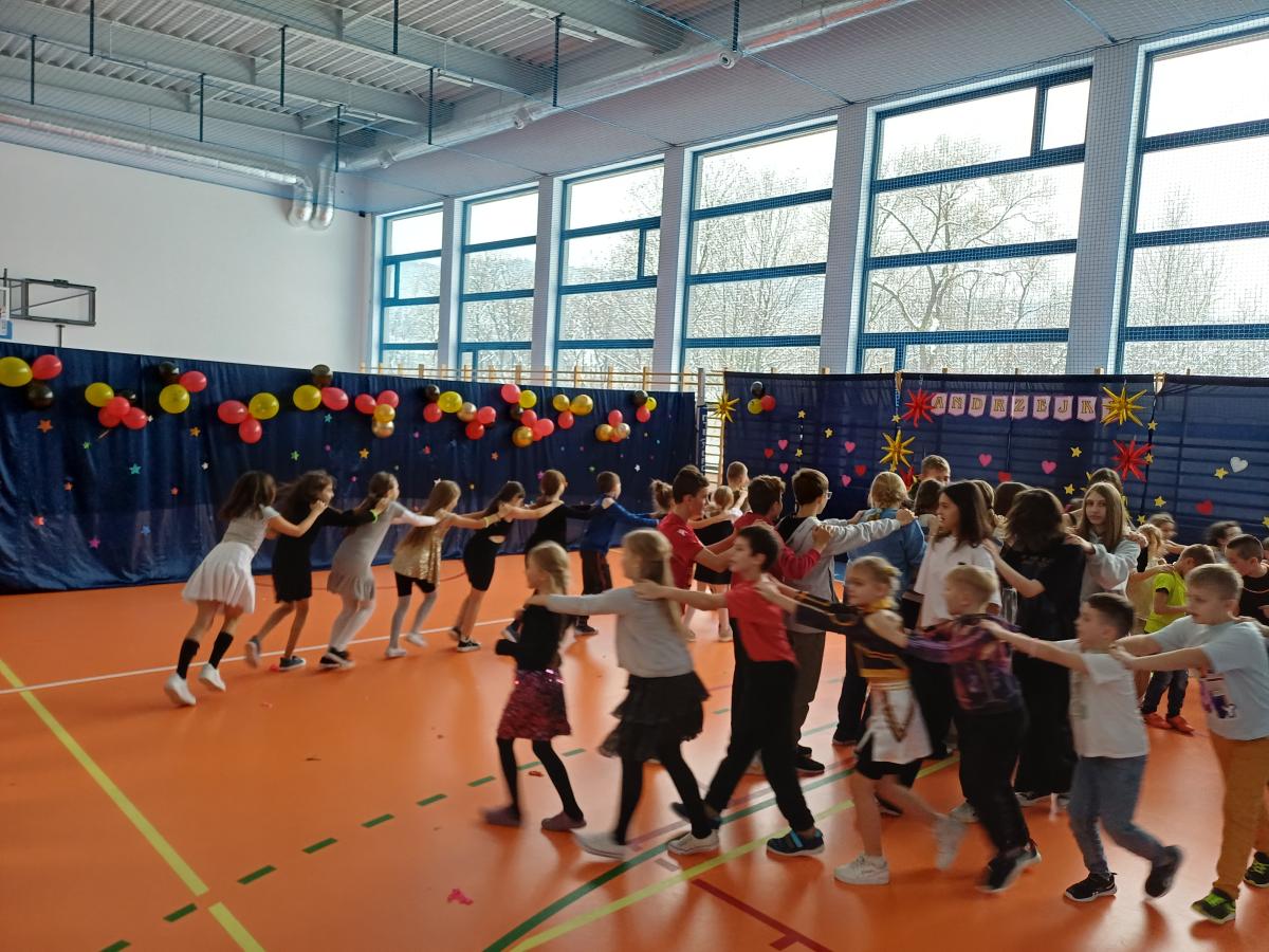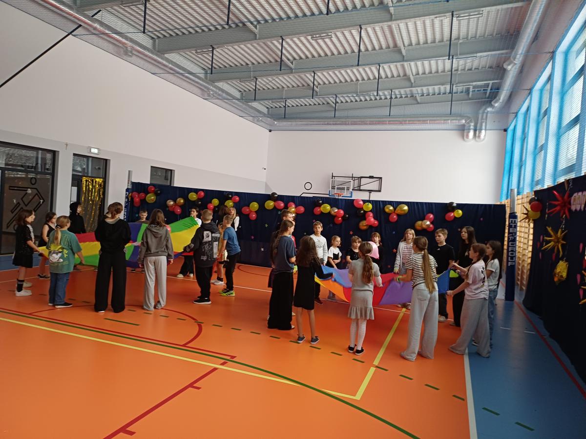 Kulminacyjnym punktem wydarzenia była wspaniała zabawa andrzejkowa, która po raz pierwszy odbyła się na naszej nowej sali gimnastycznej. Uczniowie brali udział w różnorodnych grach i konkurencjach ruchowych, takich jak odbijanie balonu w parach za pomocą kartki gazety, zabawy z chustą animacyjną czy przenoszenie piłeczek pingpongowych przy użyciu dwóch słomek. Śmiech i dobra energia towarzyszyły zabawie od początku do końca.