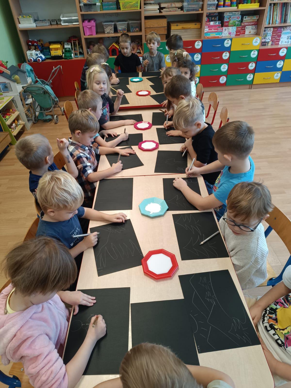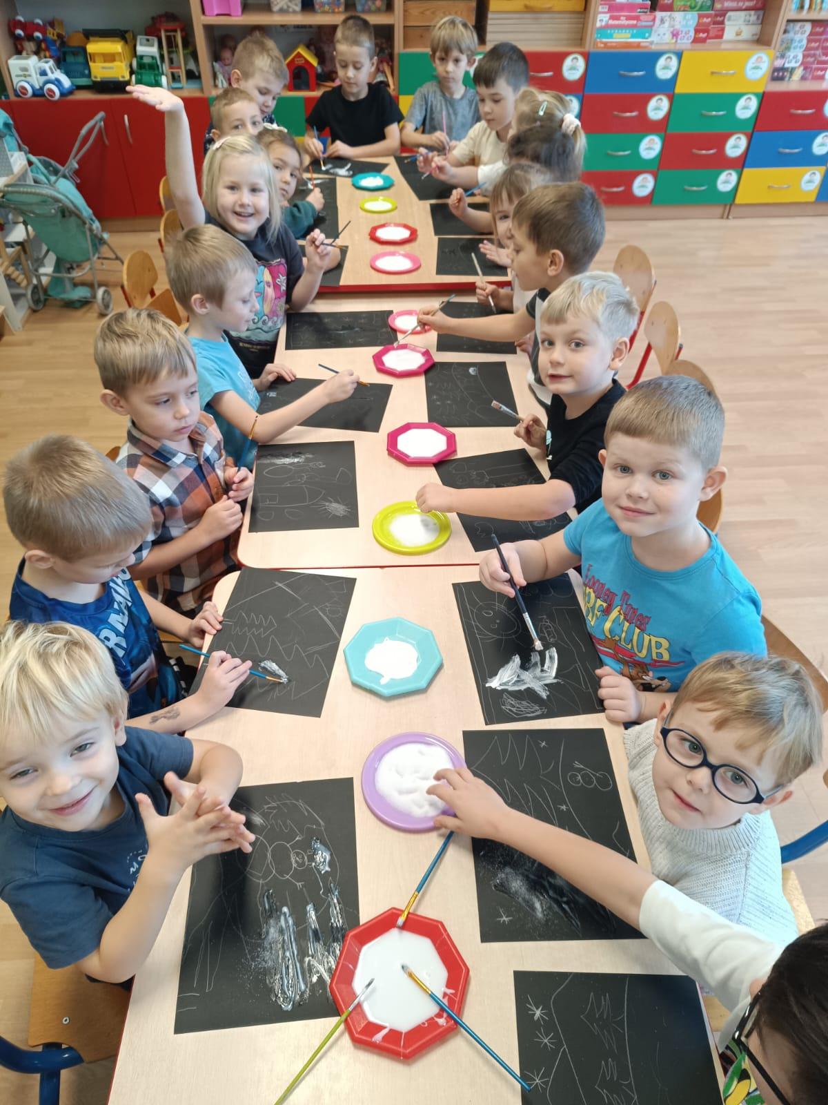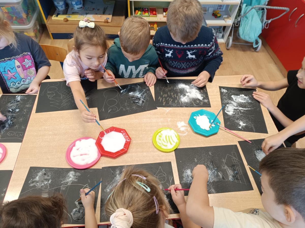 Dzieci rozpoczęły od naszkicowania konturów zimowych motywów – płatków śniegu, bałwanków, choinek czy lodowych wzorów. Następnie starannie obrysowywały je klejem, a potem posypywały solą, która sprawiała, że całość nabierała wyjątkowej faktury.