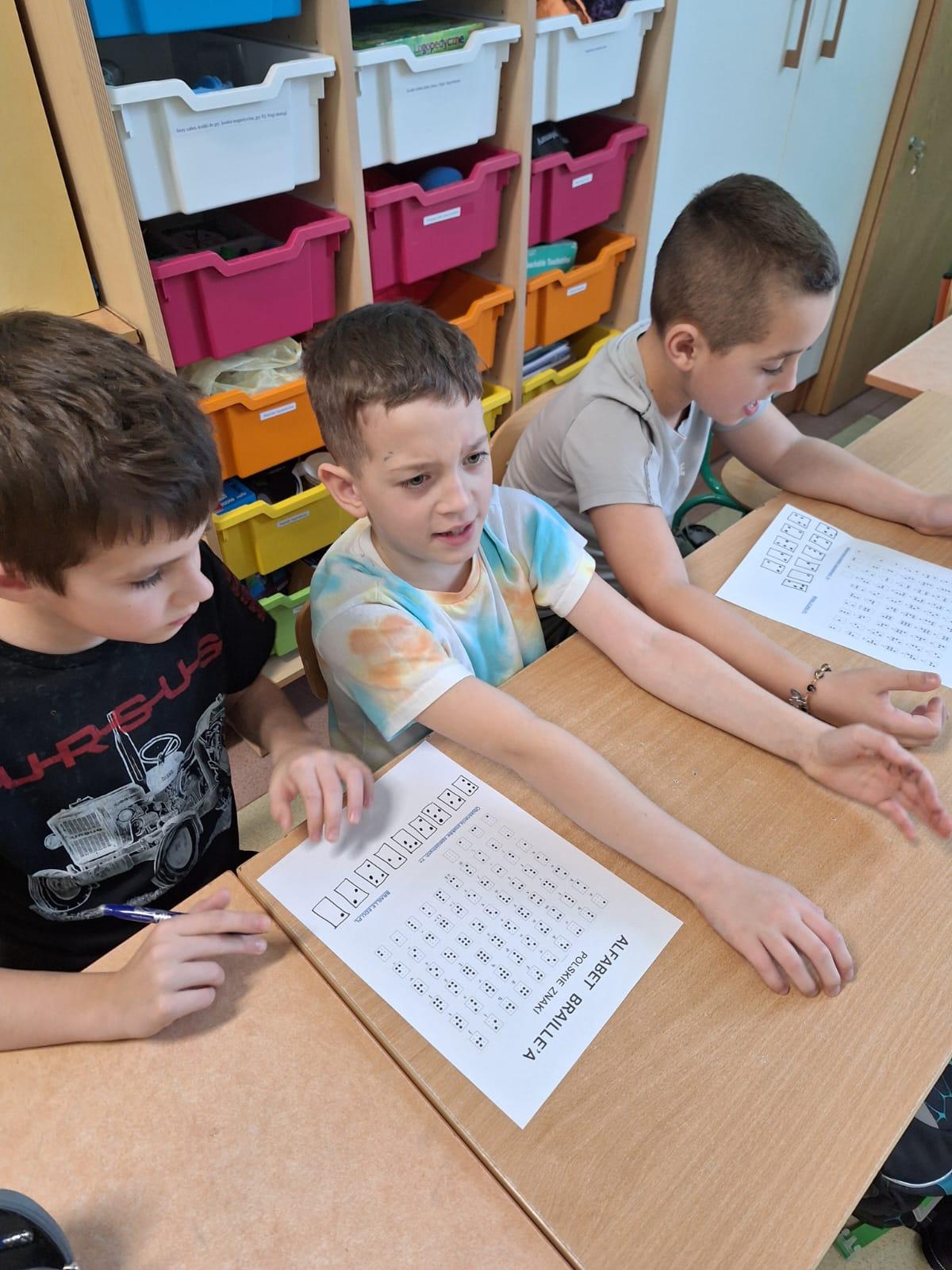 Ważnym elementem zajęć była pogadanka z tyflopedagogiem oraz poznanie alfabetu Braille’a. Uczniowie pracowali z kartami pracy, na których rozszyfrowywali wyrazy zapisane w brajlu, ucząc się, jak osoby niewidome czytają świat. Oba dni zajęć pozwoliły uczniom lepiej zrozumieć potrzeby osób z różnymi rodzajami niepełnosprawności, rozwijać empatię, otwartość oraz umiejętność mówienia o niepełnosprawności w sposób pełen szacunku. Uczniowie chętnie i aktywnie uczestniczyli w części warsztatowej, dzieląc się przemyśleniami i refleksjami.