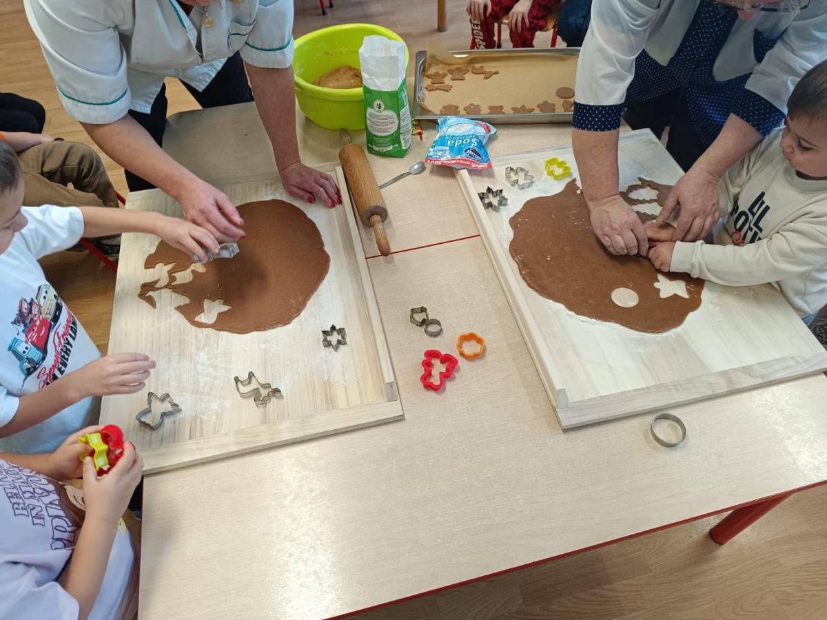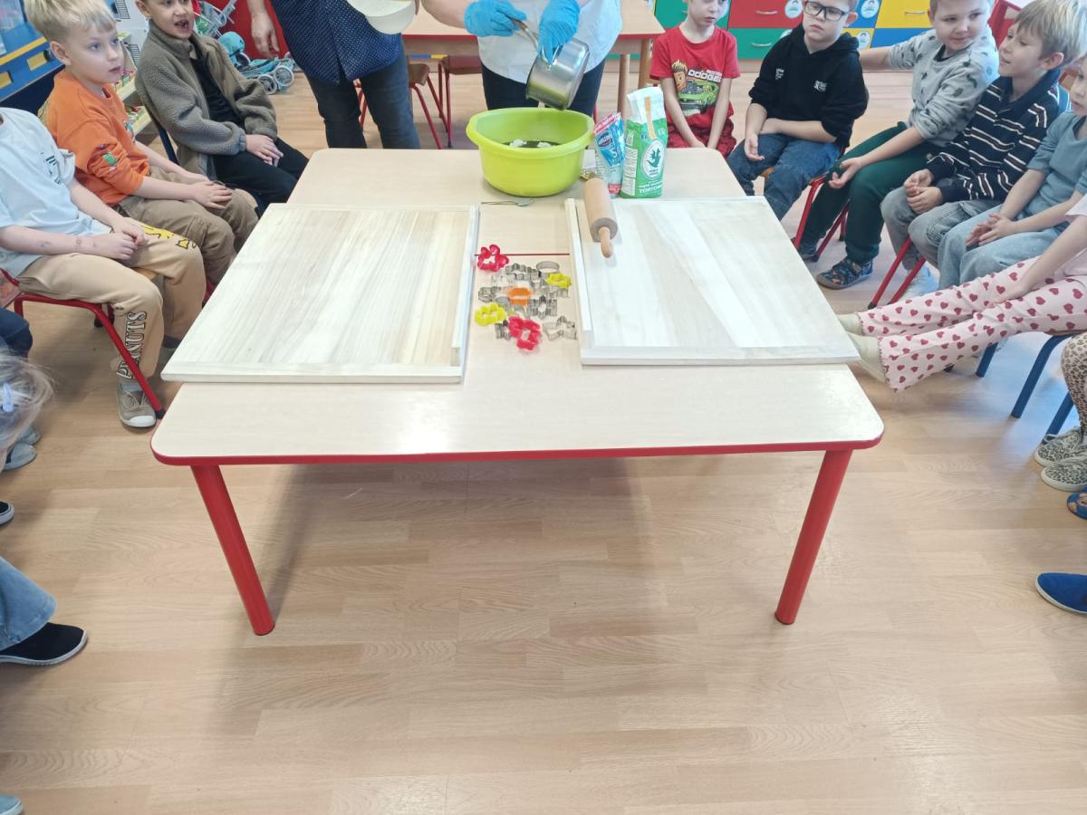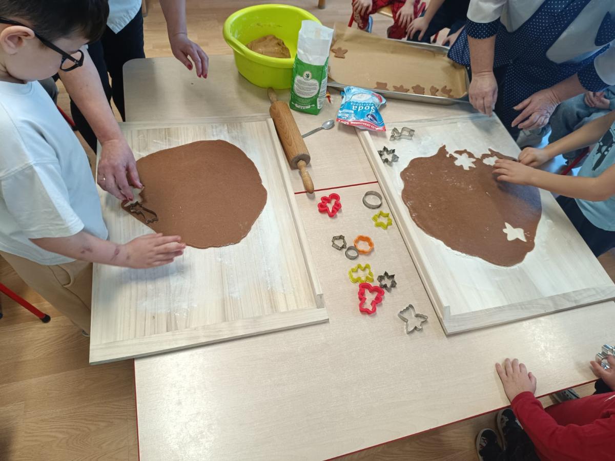 Tego dnia w całym przedszkolu unosił się zapach korzennych przypraw, a przedszkolaki mogły zobaczyć, jak powstaje ciasto na pierniki — od odmierzania składników, poprzez wyrabianie, aż po wałkowanie.