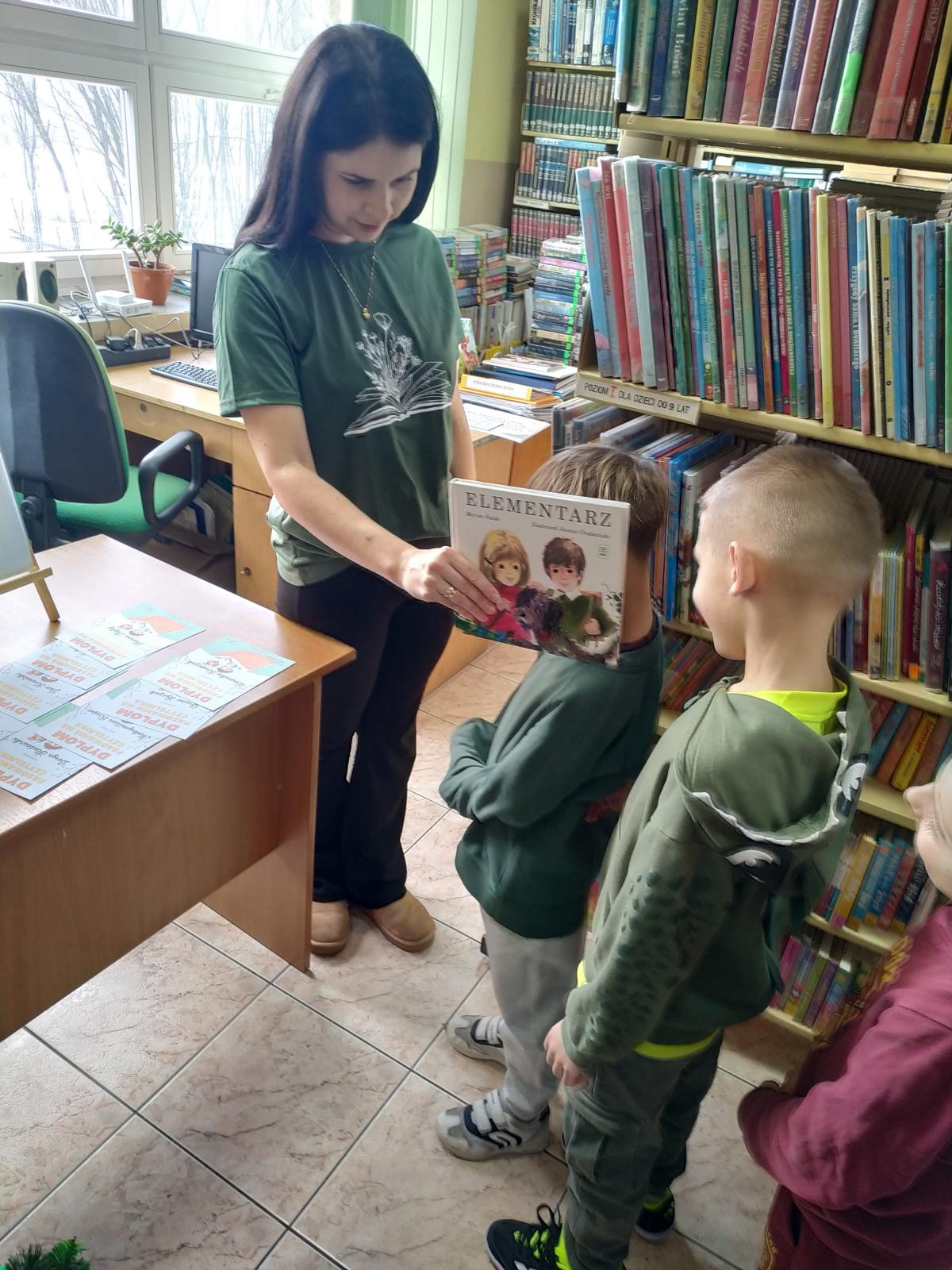 Dnia 28.01. 2026r. uczniowie klasy pierwszej wybrali się do biblioteki, aby zapoznać się z pracą bibliotekarza, regulaminem biblioteki i zasadami wypożyczania książek. Nastąpiło również pasowanie na czytelnika oraz wypożyczenie lektury „Cukierku, ty łobuzie”. Uczniowie otrzymali specjalną wyprawkę czytelniczą i zapewnili, że będą stałymi bywalcami biblioteki.
