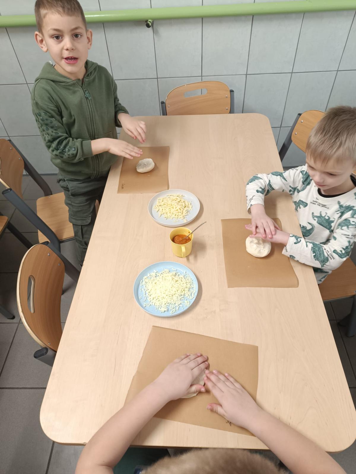 Podczas warsztatów każde dziecko samodzielnie przygotowało swoją pizzę. Przedszkolaki z ogromnym zaangażowaniem smarowały ciasto sosem, a następnie wybierały i układały ulubione składniki.