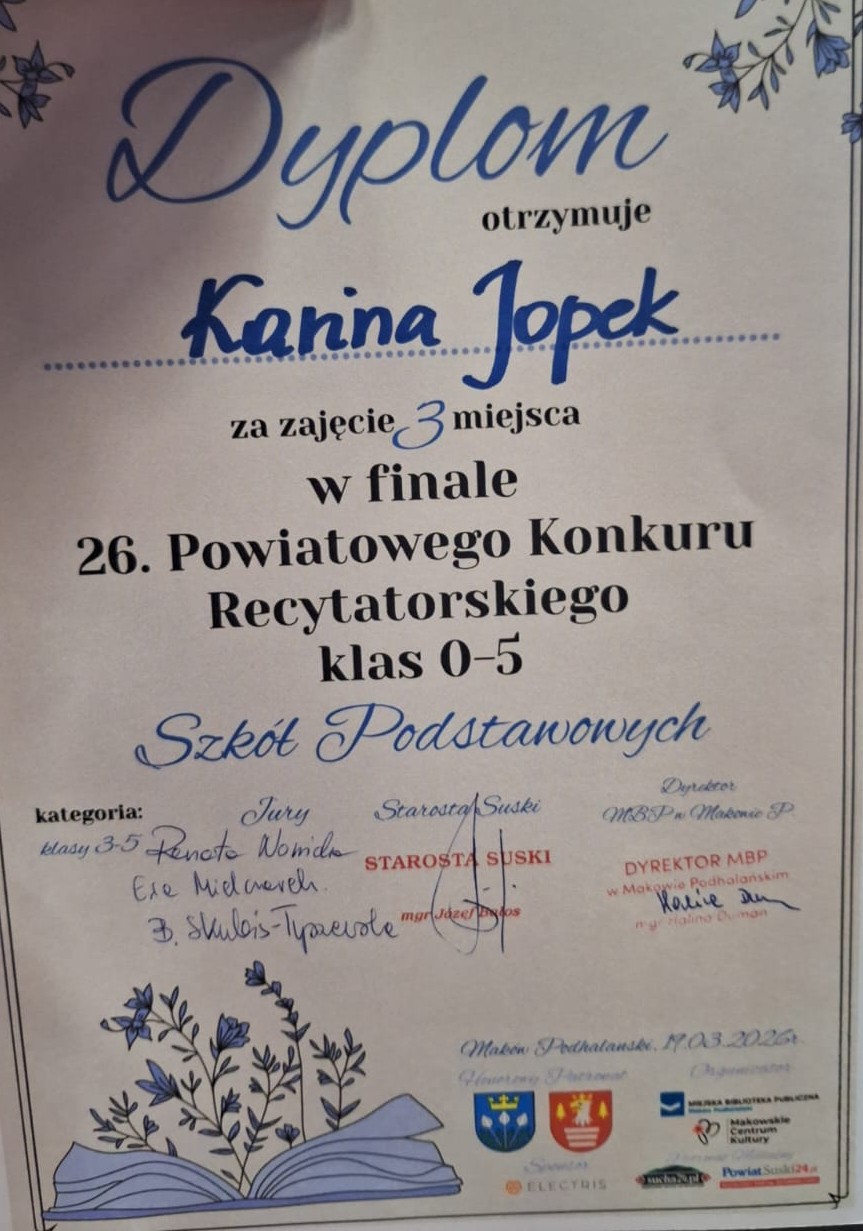 Miło nam poinformować, że uczennica naszej szkoły Karina J. zajęła III miejsce w kategorii: klasy 3-5.
